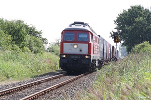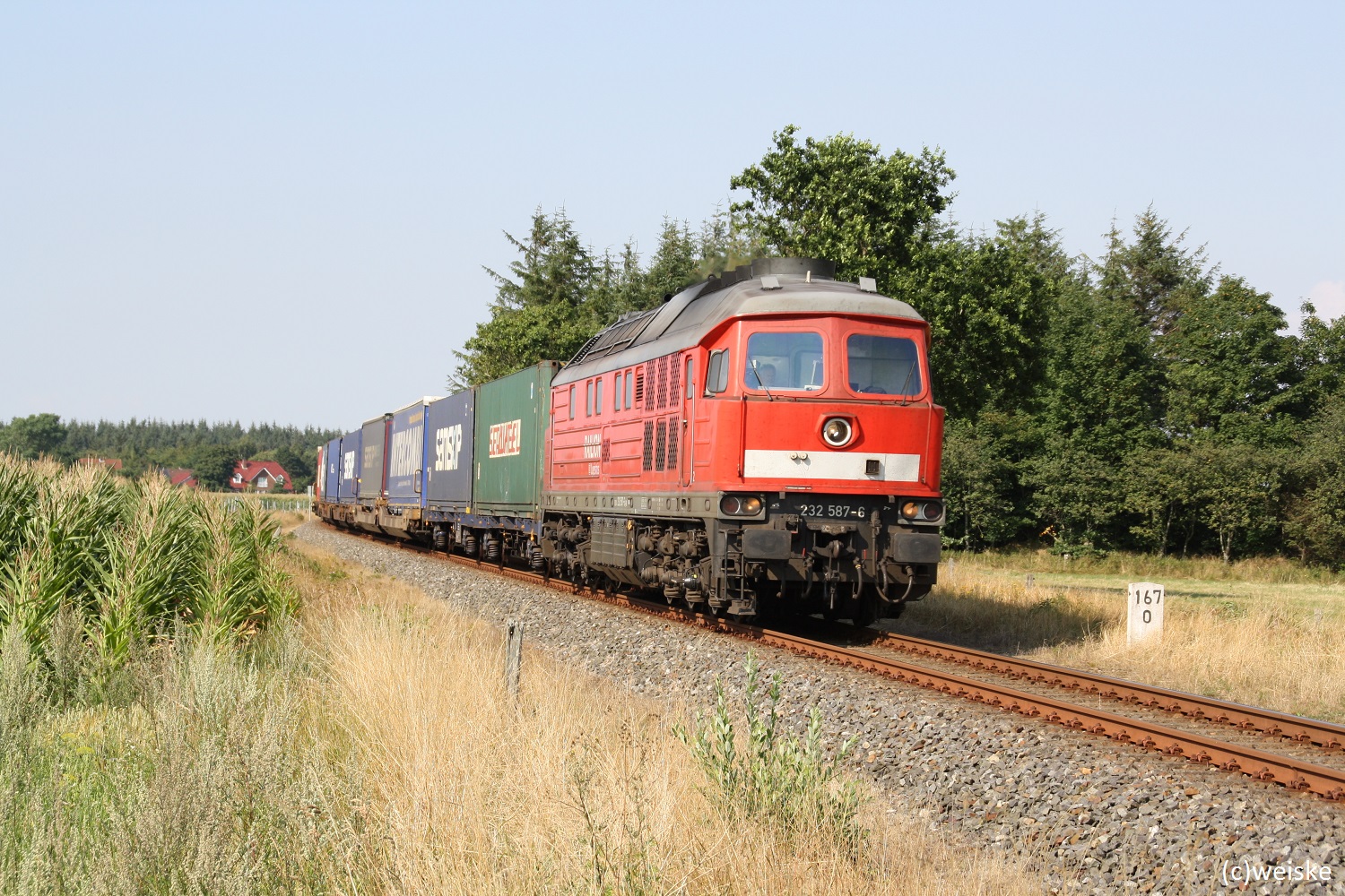 Wir haben am Bahnübergang in Holm Stellung bezogen. Unser Warten wird von 232 587-6 mit einem weiteren Containerzug belohnt.