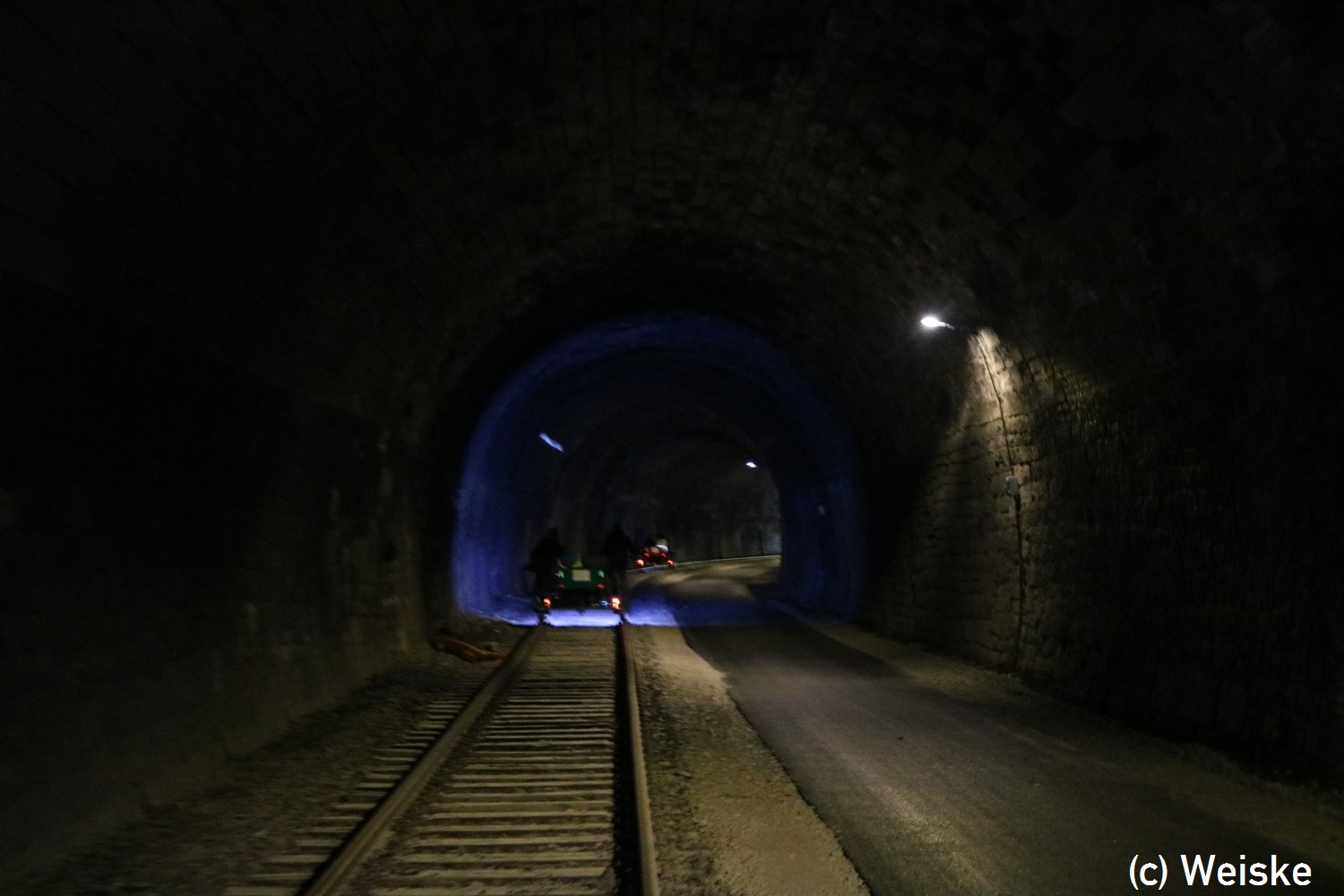 Rasant erscheint die Talfahrt, doch die Draisinen sind in ihrer Rollgeschwindigkeit begrenzt und sicher. Nur selten hat man die Möglichkeit einer so genauen Detailstudie von alten Tunnelröhren, wie bei unserem Ausflug hier.
