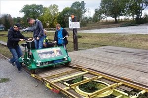Schritt 5: Mit Freude aller Beteiligten über das vollbrachte Werk schiebe man nun die Draisine auf ihren angedachten Halteplatz. Da bei der Rückfahrt die Drehscheibe nochmals überquert wird, führe man dies ausschließlich ohne Passagiere und nur seitlich schiebend durch. Anschließend kann mit frischen Kräften die Talfahrt beginnen.