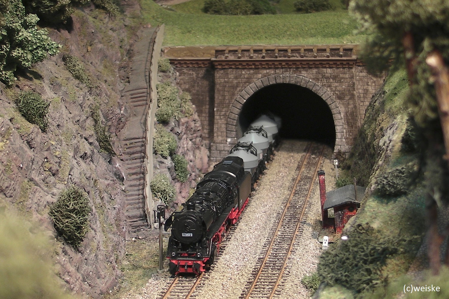 In flotter Fahrt kommt uns in Höhe der Stausee-Brücken ein Schnellzug entgegen. Vorbei an den Weinstöcken geht die Fahrt, um nach kurzer Zeit im Tunnel zu verschwinden, der den Anlagenteil "Wendelstein" vom "Gehlberger" Ast trennt.