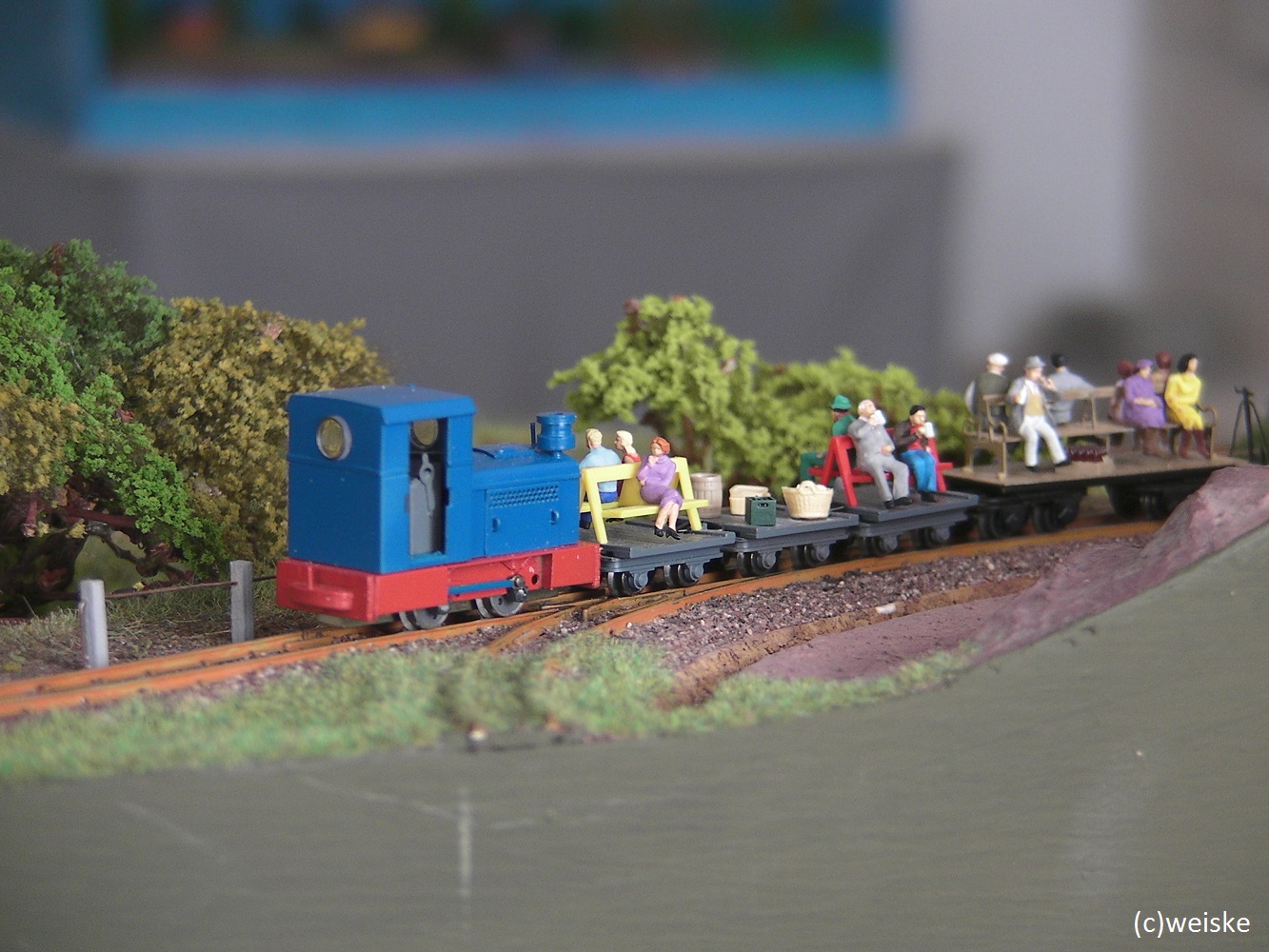 In der oberen Etage geht es diesmal "gemütlich" zu. Hier bestimmen Feld- und Schmalspurbahnen das Geschehen. Mit einem "Vereinsausflug" am Haken kommt eine kleine Feldbahnlok durch die Landschaft gezuckelt.