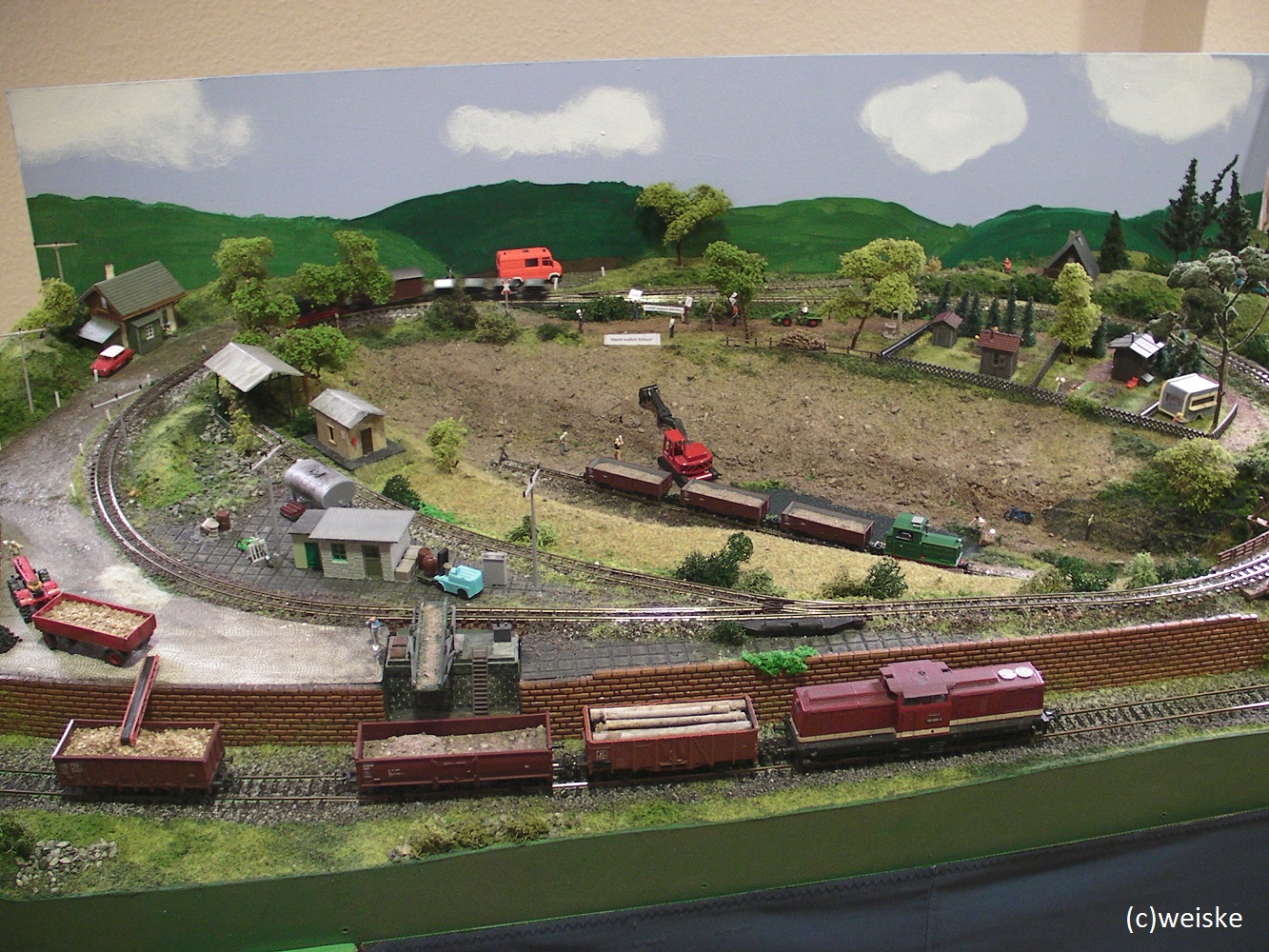 Ebenfalls auf kleinem Raum arbeitet hier die Eisenbahn. Eine Feldbahn schafft auf der Anlage von G. Freytag den Kies zur Verladestelle, wo dieser in die Wagen der Normalspur verladen wird.